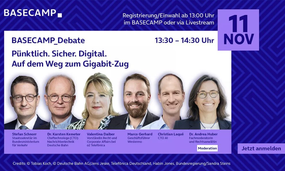 Am 11. November 2025 diskutiert das BASECAMP Berlin über die digitale Zukunft der Bahn: Unter dem Motto „Pünktlich. Sicher. Digital.“ geht es um den Weg zum Gigabit-Zug – mit schnellen Netzen, stabiler Verbindung und mehr Sicherheit im Bahnverkehr.