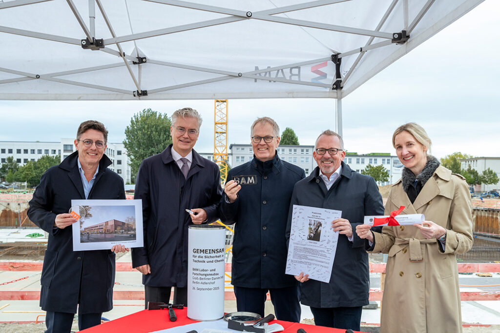 Mit der Grundsteinlegung für ein neues Labor- und Forschungsgebäude der Bundesanstalt für Materialforschung und -prüfung (BAM) stärkt Berlin-Adlershof seine Bedeutung als Hightech- und Wissenschaftsstandort. Der Neubau schafft moderne Infrastruktur für elf Fachbereiche der BAM und bietet Raum für hochspezialisierte Forschung rund um Materialprüfung, Sicherheit und innovative Technologien.